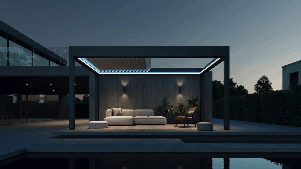 Időjárásálló kialakításának köszönhetően a pergola egész évben kényelmes kikapcsolódást nyújt. Véd a tűző napsütéstől, az esőtől és a széltől, így a szabadban töltött idő mindig zavartalan maradhat. Igény szerint oldalfalakkal és kiegészítő világítással is felszerelhető, hogy minden napszakban kellemes légkört teremtsen.